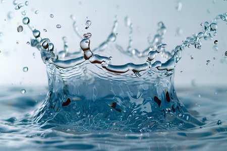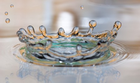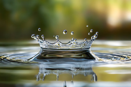Splash crown: A water droplet forms a crown shape as it impacts a calm surface creating ripples and droplets.