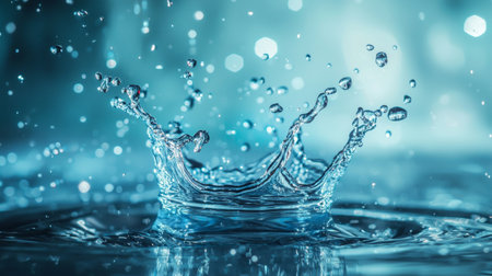 Dynamic water splash creating crown formation on teal blue fluid. Crystal clear liquid droplets suspended in mid air over rippled surface. Refreshing splash photography showing movement and surface tension. Blue aquatic motion capture with light reflections.