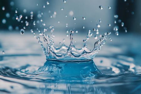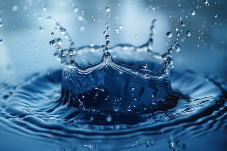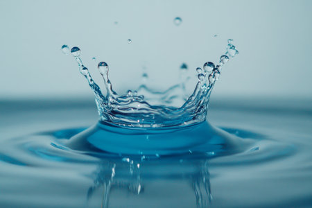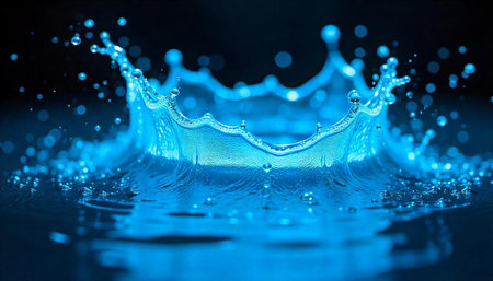 High-speed water droplet splash creating crown shape in blue