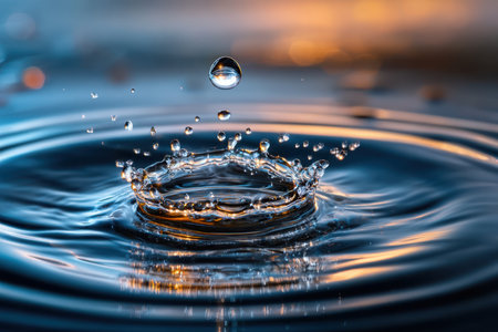 A droplet of water strikes a tranquil surface, causing ripples and capturing the soft evening light.