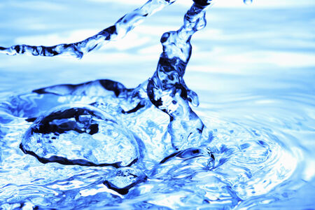 Drops of water close-up macro with a sunlight fall on the heavy splash water surface on a blue background