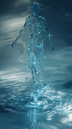 Vibrant water droplets ripple gently across tranquil blue fluid, forming intricate splash designs amid a softly blurred backdrop illuminated by gentle natural sunlig