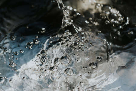 Water splashes with bubbles. Fluid in motion. Selective focus. Close up and horizontal orientation.