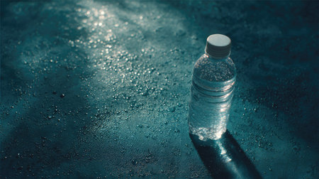 A clear plastic water bottle sits on a textured surface adorned with droplets, illuminated by soft light, evoking a sense of freshness and tranquility.