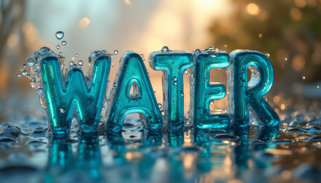 The image captures the word WATER crafted from shimmering droplets, reflecting light beautifully against a blurred, warm background. This artistic representation emphasizes the essence of water, evoking feelings of freshness and vitality, while the sparkling droplets create a mesmerizing visual effect.