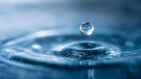 A stunning close-up of a water drop falling and creating ripples on a calm surface. The blue tones and reflections evoke a sense of tranquility and elegance.