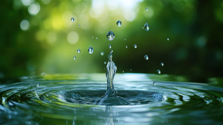 Captivating moment of water droplets splashing and creating ripples on a tranquil water surface, showcasing the beauty of liquid dynamics and reflections.