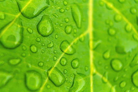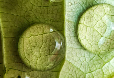 Large beautiful drops of transparent rain water on a green leaf macro. Beautiful leaf texture in nature. Natural background,