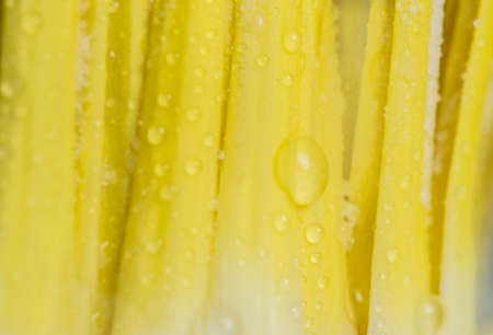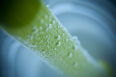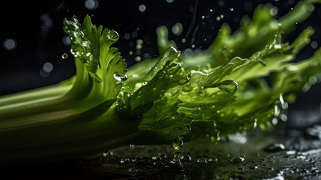 Soft rain falling gently on Celery, with water droplets forming and slowly dripping. The background is softly blurred with a natural, moody atmosphere.