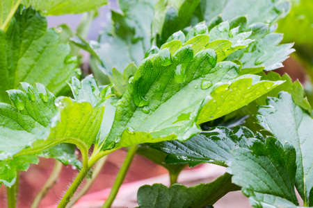 close up of wet young strawberry plants and leaves, selective focus on the center leaves
