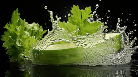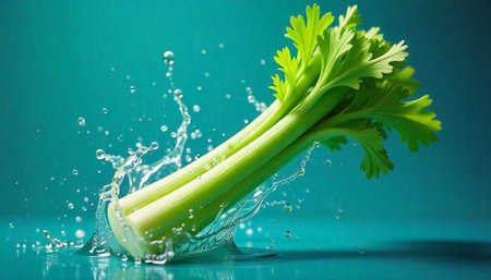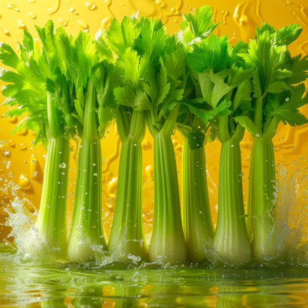 Crisp, green celery stalks arranged against a bold yellow textile backdrop to evoke freshness and vitality, perfect for health, cooking, or farm-to-table themes.