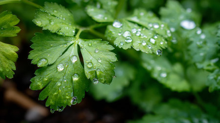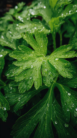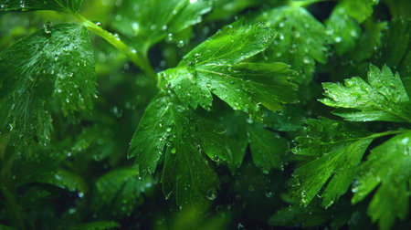 Celery seed in gentle light rain, soft raindrops visible on vivid green leaves, natural realistic style, bright fresh colors, balanced wide composition, cinematic framing, highly detailed, seamless for video continuation.