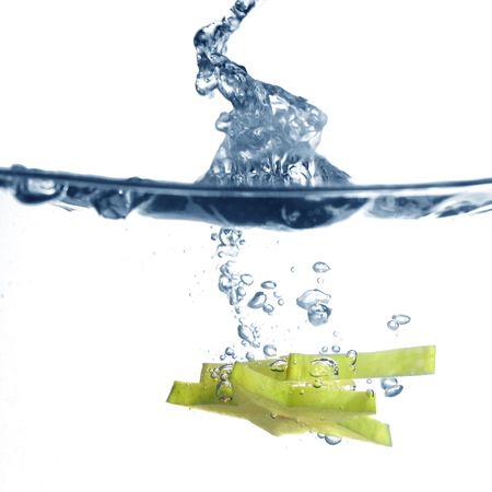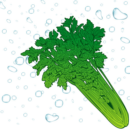 Slice and stem of celery over blue background. Healthy eating, vegetarian food, diet, dieting concept