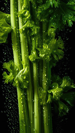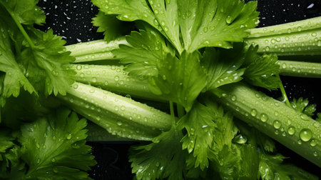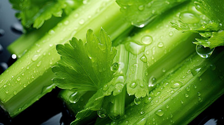 A close-up, overhead view of a bunch of fresh, vibrant green celery stalks. The crisp vegetables are arranged closely together, with some showing delicate water droplets on their surfaces.