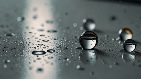 symphony of abstract water droplets on a reflective surface, creating a serene and contemplative atmosphere