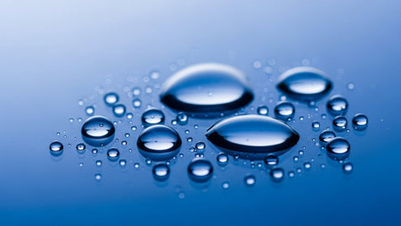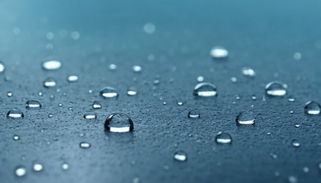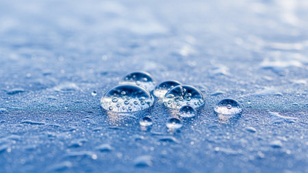 Macro view of water droplets on smooth blue surface with bokeh effect.