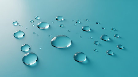 a close-up view of numerous water droplets scattered across a smooth, vibrant blue surface. The droplets vary in size, with some larger ones prominently displaying spherical shapes and clear reflections of light. The background is a soft gradient of cyan and teal, creating a sense of depth and tranquility. The lighting highlights the transparency and purity of the water, emphasizing its refreshing and clean qualities. The overall impression is one of natural beauty and simple elegance,...