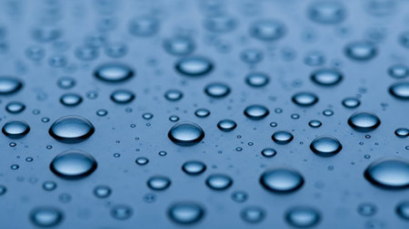 A blue surface with many small drops of water on it. The drops are clear and shiny, reflecting the light. Concept of calmness and tranquility, as the water droplets seem to be suspended in mid-air
