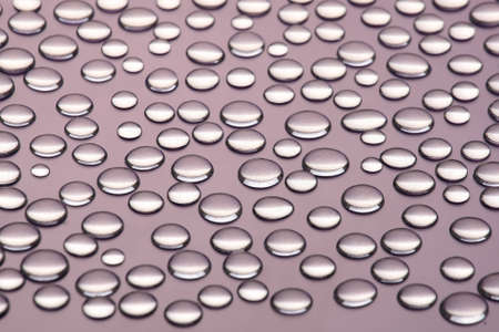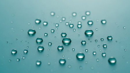 Macro view of many small water droplets scattered across a textured surface with a soft blue-green gradient background.