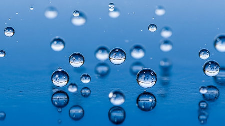 A close-up view of numerous water droplets of varying sizes scattered across a smooth, reflective blue surface. The droplets are clear and transparent, with distinct highlights and reflections of light, creating a sense of depth and purity. The blue background is softly lit, enhancing the cool and refreshing appearance of the water. captures the delicate beauty of liquid in its natural form.