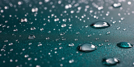 Water Droplets on Green Metallic Surface Showcasing a Hydrophobic Effect for Advertising