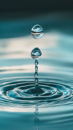 A detailed close-up of a water droplet splashing on a calm water surface, creating ripples in a serene blue setting.