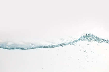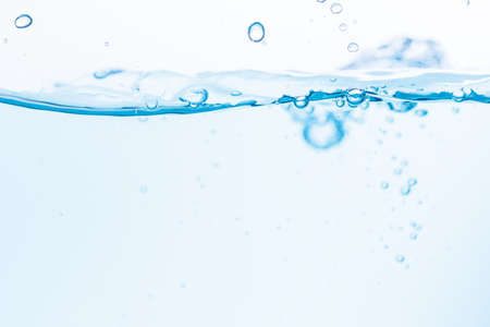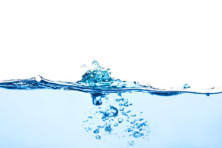 Close up water splash with air bubbles. Fresh and clean surface aqua flowing in wave and clean water on white background isolated. Advertising image with free space for your work
