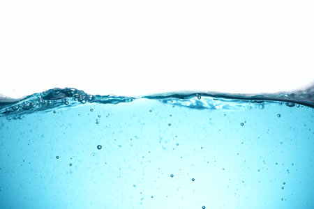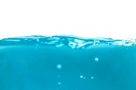 Abstract clean flow ripple surface on liquid. Light blue water wave with air bubbles and a little bit splashed underwater, studio shot isolated on white background
