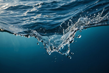 Macro view of water splash with dynamic bubbles, showing ripples and waves. Pure water surface in blue hues with light reflections.