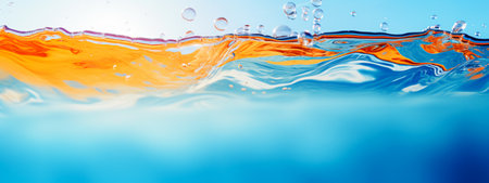 Orange water splash with bubbles on blue background. selective focus. Generative AI.