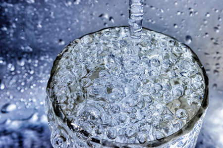 Clear drinking water falls into a clear glass healthy wholesome fresh water with no odor or taste splash of water drops splashing onto the surface jet of water entering the glass