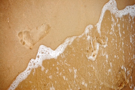Footprint on the sandy beach is washed by the wave.