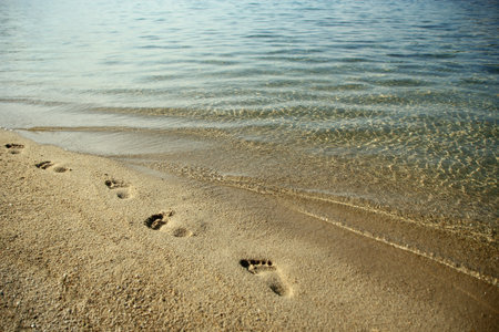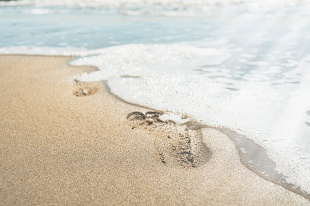 Traces of feet in the sand on the beach and a wave washed them