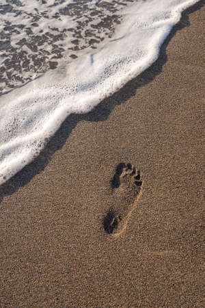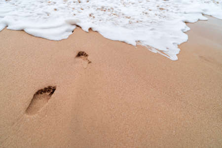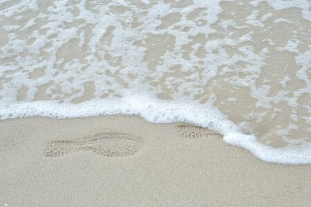 Human footprints in the sand by the sea and sea foam