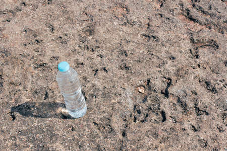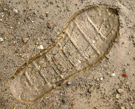 Track of shoe of man on moist spring sand. Abstract background, texture of river sand and shallow stone.