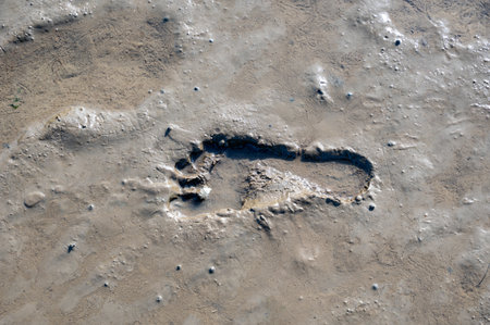 Human footprint in wet, muddy soil in the Wadden Sea in sunlight
