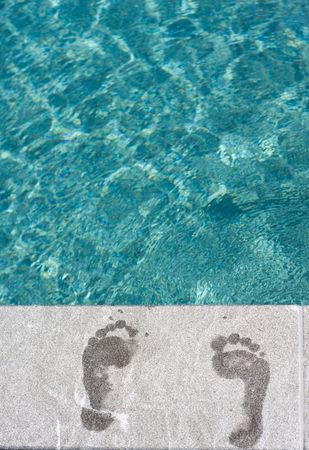 Footprints with turqoise blue swimming pool at vacation resort