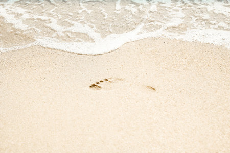 Human footprint on sand summer tropical beach background with copyspace.