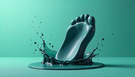 Turquoise foot emerging from splash of liquid against background