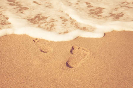 stamp of feet on sand on the beach with sunshine in the morning, vintage color style