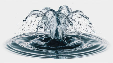 A dynamic, high-speed macro photograph of water splashing, frozen in time against a dark blue background. The clear liquid forms intricate shapes and droplets, capturing the concepts of purity, refreshment, and motion.