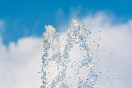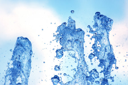 Splashes of water against the blue sky background. Fountain, a jet of water against the blue sky.