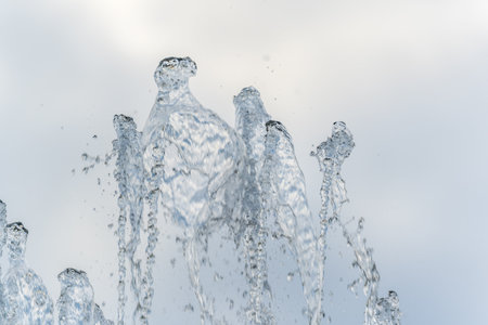 Splashes of water against light background. Fountain, a jet of water against cloudy sky.
