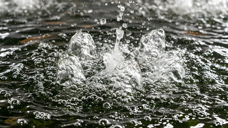 A close-up view of water jets bubbling and splashing in a fountain. The crystal clear water droplets are frozen in motion against the dark water surface.