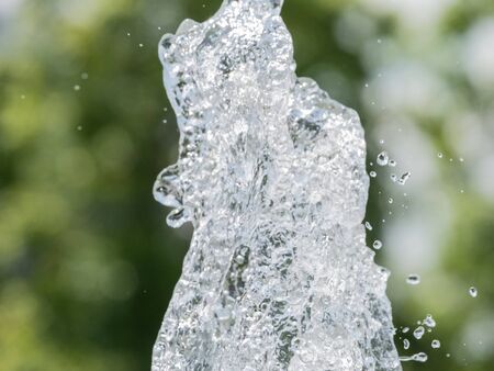 Water splashes from fountain on vivid green background. Natural texture of only water of fountain against greenery. High waves effect in hot summer with copy space. Water sprays in sunny day close-up.