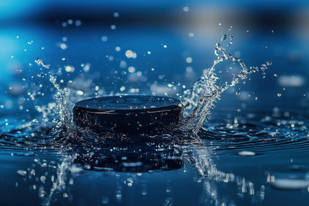 Black hockey puck splashing into crystal clear blue water with dynamic motion