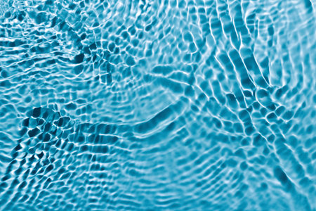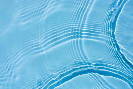 Close up on defocused blue water surface texture with ripples. Top view abstract background.