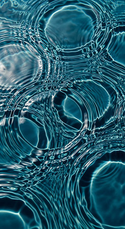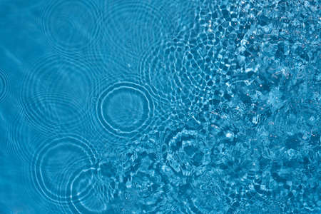 Blue water background with drop circles, splashes and ripples on the surface. Creative background design