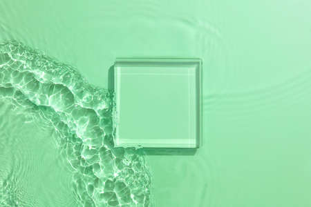 Empty Glass circle podium on transparent clear green water texture with splashes and waves in sunlight. Abstract nature background for product presentation. Flat lay cosmetic mockup.