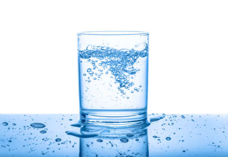 water in transparent glass with drops and bubbles isolated over white, blue background, close up